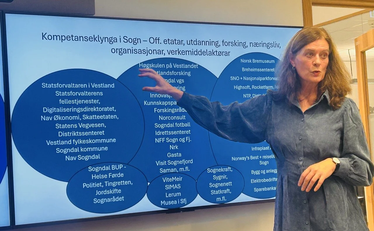 Anne Karin Hamre, direktør ved Vestlandsforsking, gav deltakarane ei grundig innføring i korleis regionale innovasjonssystem fungerer, og kor avgjerande desse er for verdiskaping og utvikling i distrikta. Ho peikte særleg på betydninga av samspel mellom næringsliv, forsking og offentleg sektor.