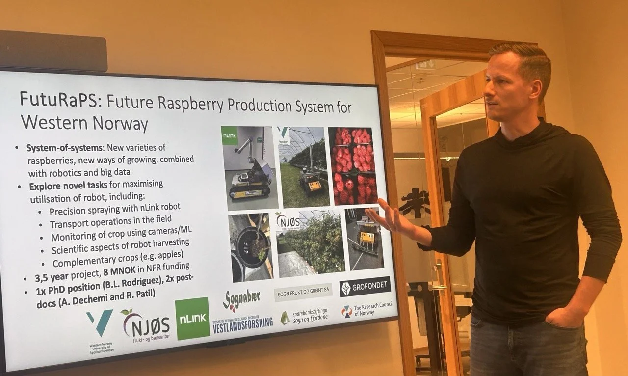 Martin Fodstad Stølen, forskar ved Høgskulen på Vestlandet og gründer av Fieldwork Robotics, delte erfaringar frå arbeidet med å byggje eit miljø for landbruksrobotikk i ei lita bygd ved fjorden. Presentasjonen synleggjorde korleis lokal kunnskap, pågangsmot og tett samarbeid kan gi store ringverknader.