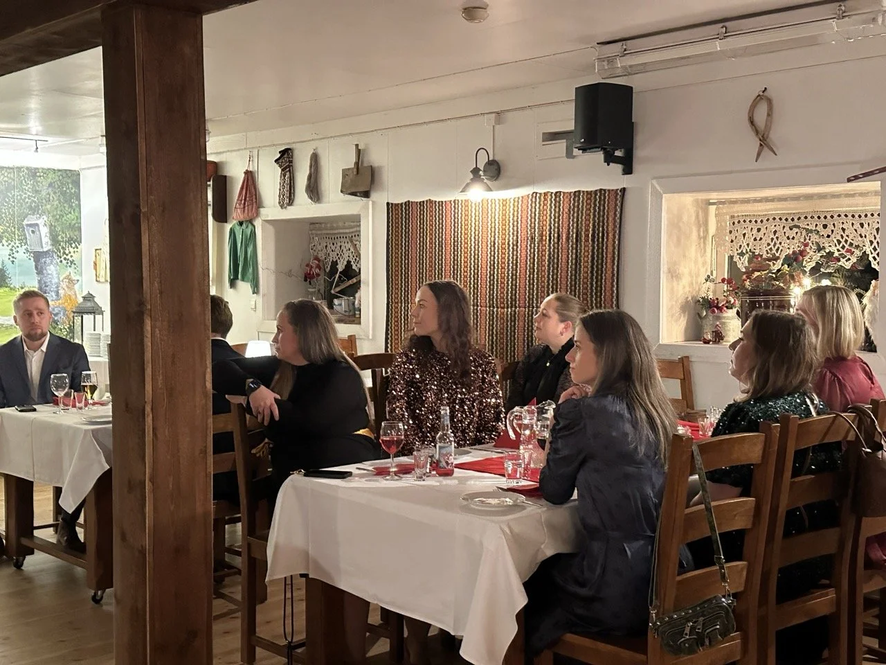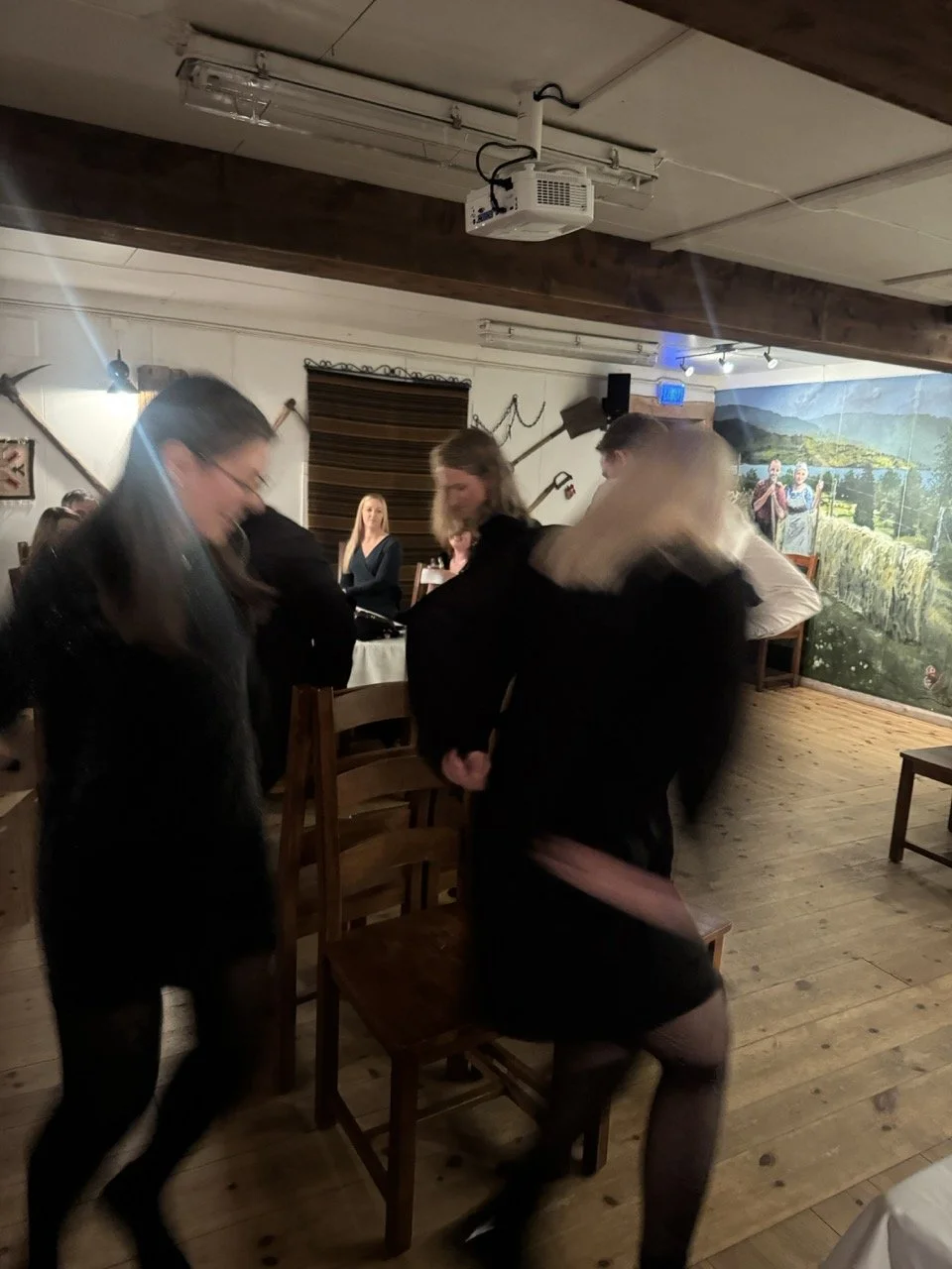 Lokalet leverte akkurat den førjulsstemninga me hadde håpa på, med tømmervegger, varme frå peisen og den karakteristiske silobaren som sette tonen for kvelden. Sjølv Gjest Baardsen ville nok hatt vanskar med å rømma frå eit slikt lag!